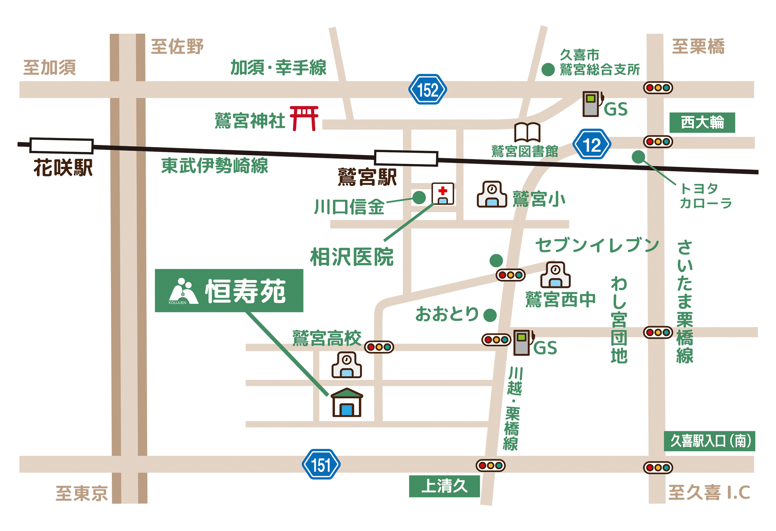 東武伊勢崎線『鷲宮駅』西口より、徒歩15分 鷲宮高校の隣です。
