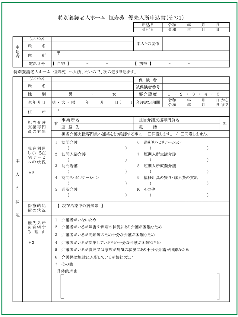 その際、恒寿苑入所申込書をお渡しします。また、記入方法等もご説明いたします。