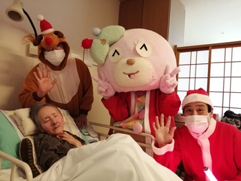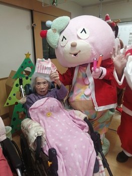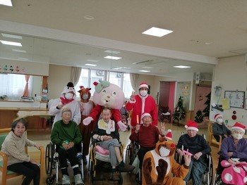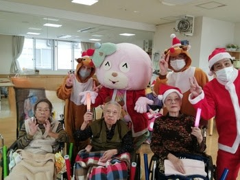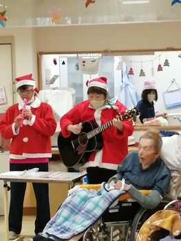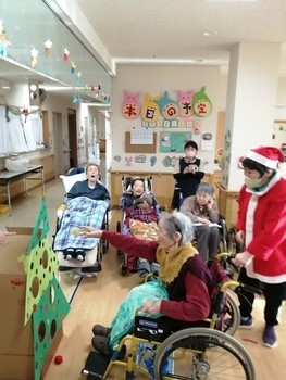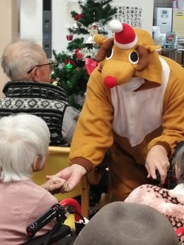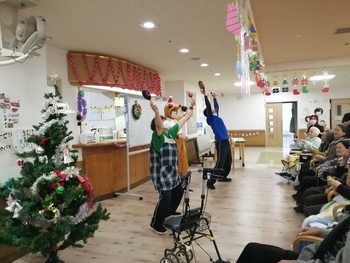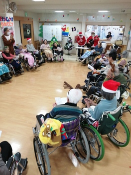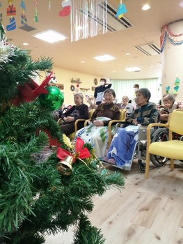 会場はクリスマスの飾りつけで華やかな雰囲気に包まれ、サンタクロースやトナカイに扮した職員が登場し、クリスマスソングを一緒に歌ったり、簡単なレクリエーションを楽しみました。
