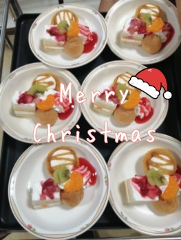 また、クリスマス会のお楽しみとして、ケーキの盛り合わせをご用意しました。色とりどりのケーキを前に「どれにしようかな」と迷われる姿も見られ、甘い時間をゆっくりと楽しんでいただきました。
