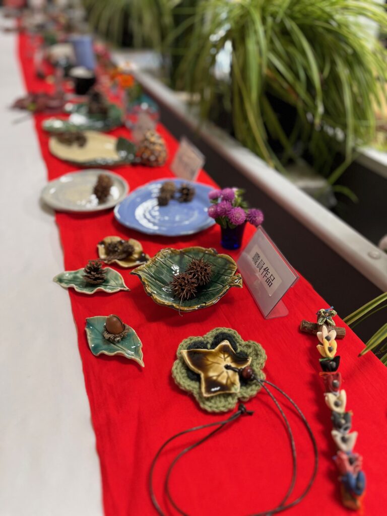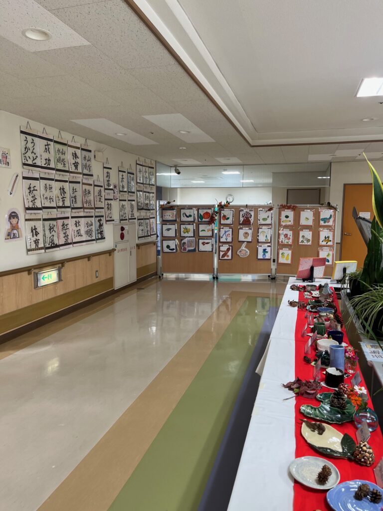 絵手紙やお習字、陶芸など、みなさんが日々の活動の中で一生懸命作った素敵な作品がたくさん並んでいます。